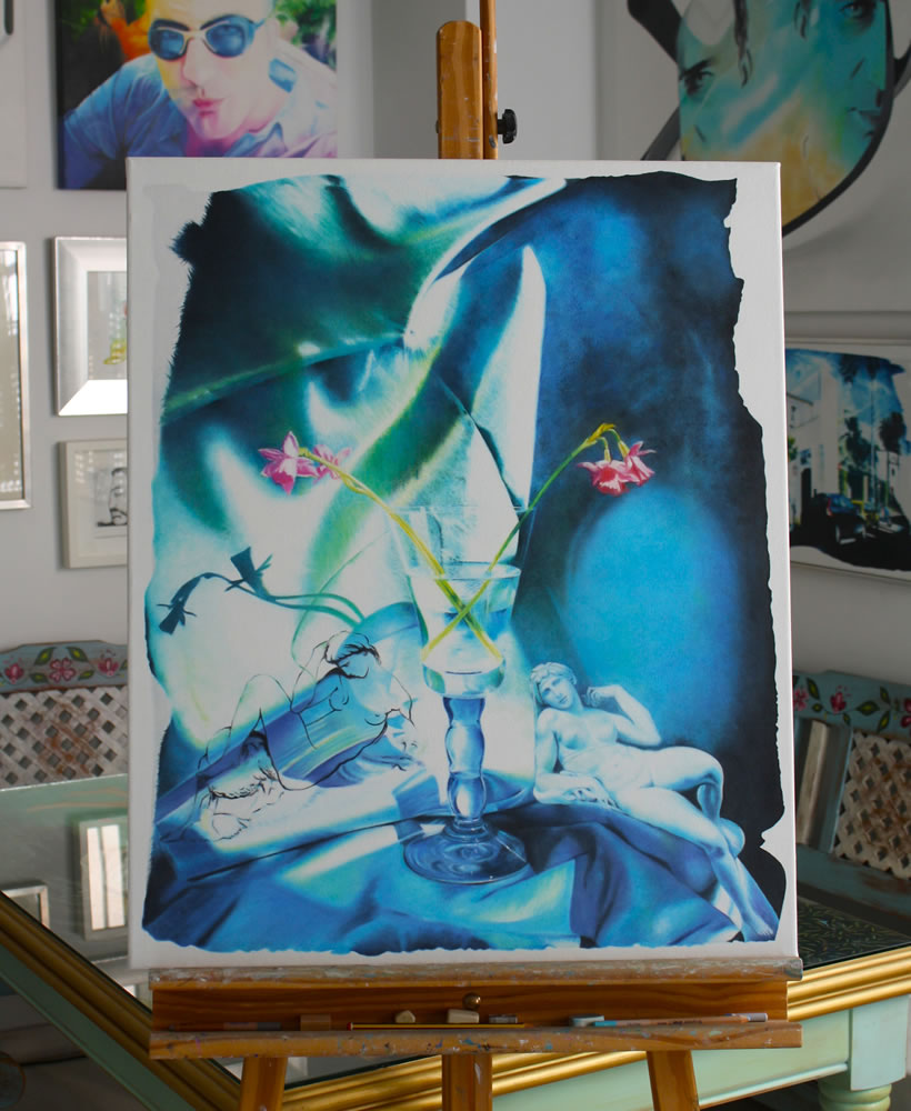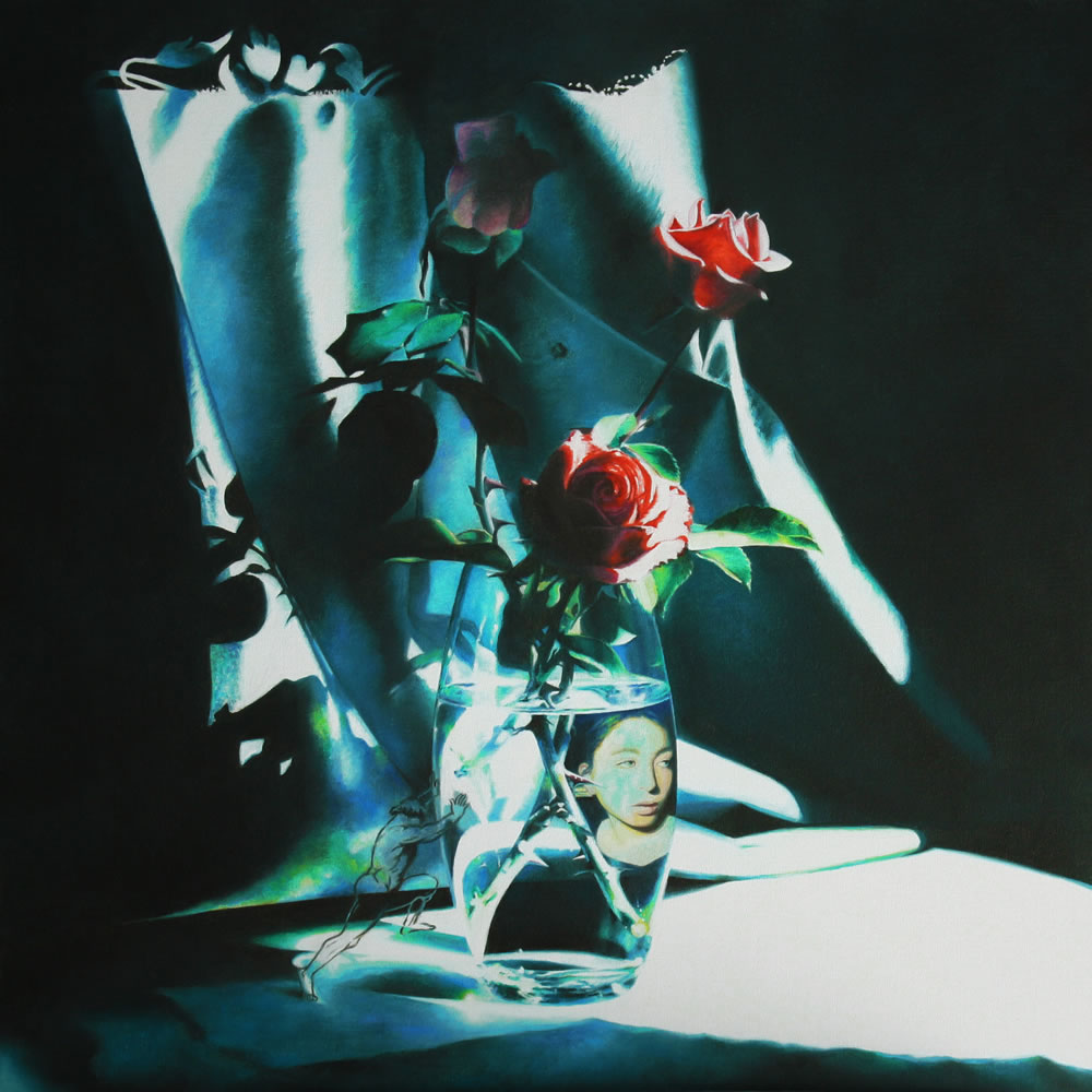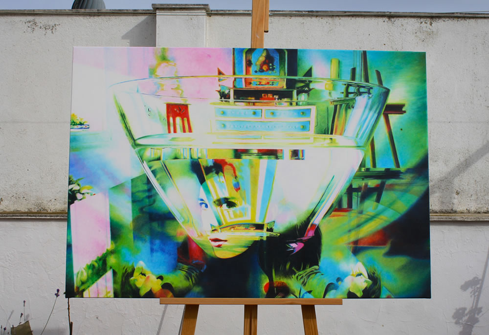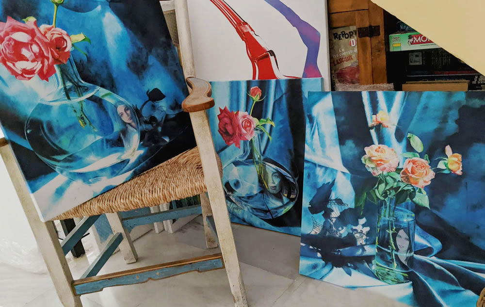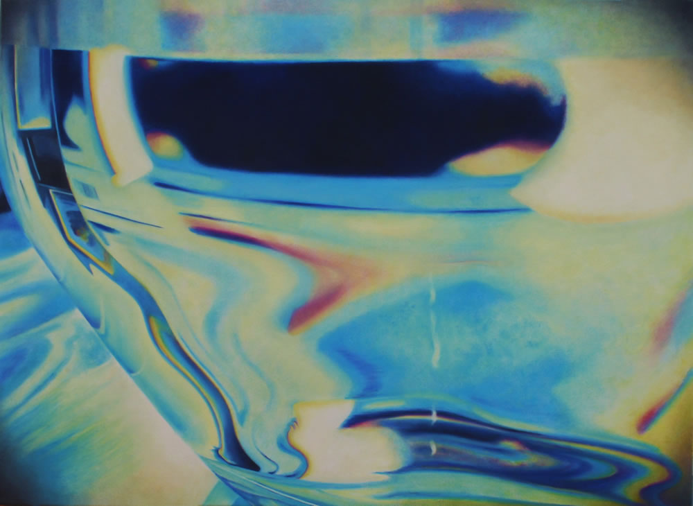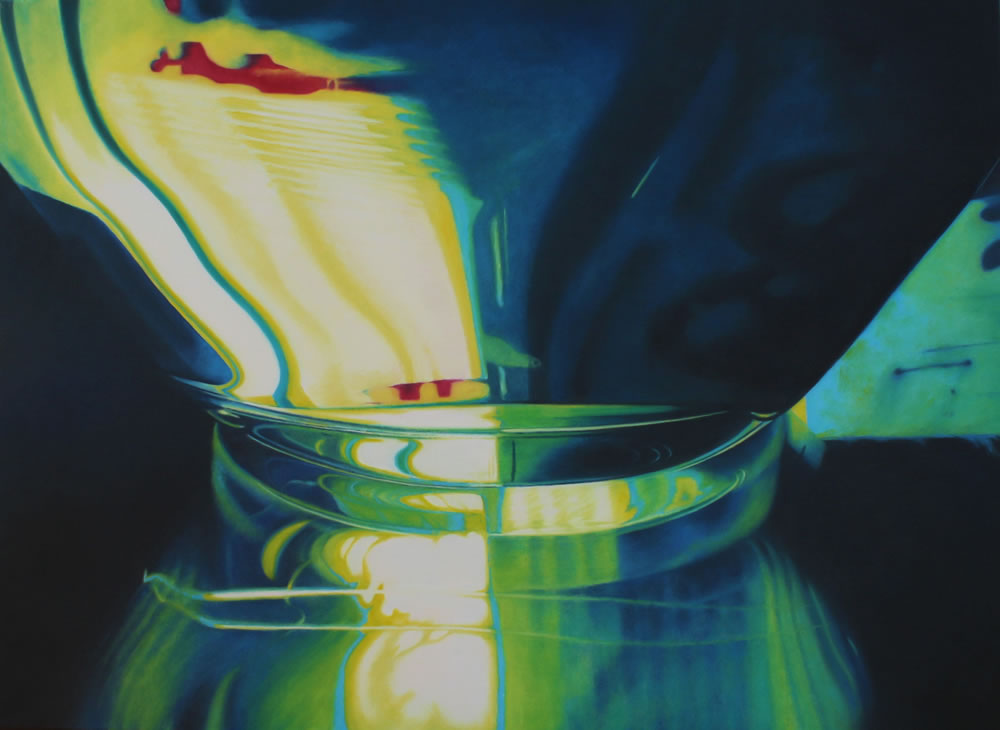 "Inmersiones" recoge una serie de pinturas al óleo inspiradas en los efectos que produce un rayo de sol al incidir sobre un recipiente de cristal con algo de agua.