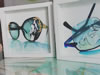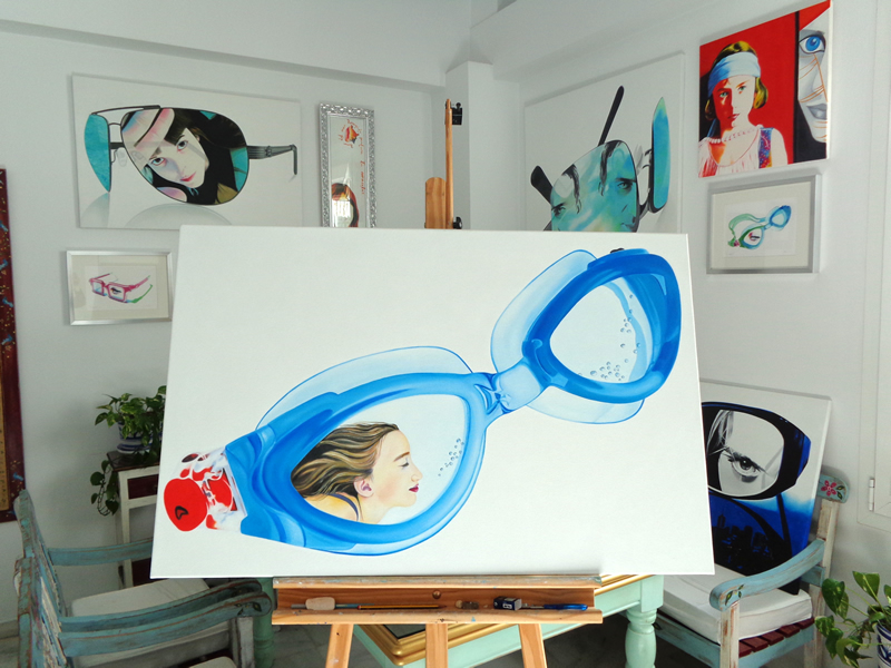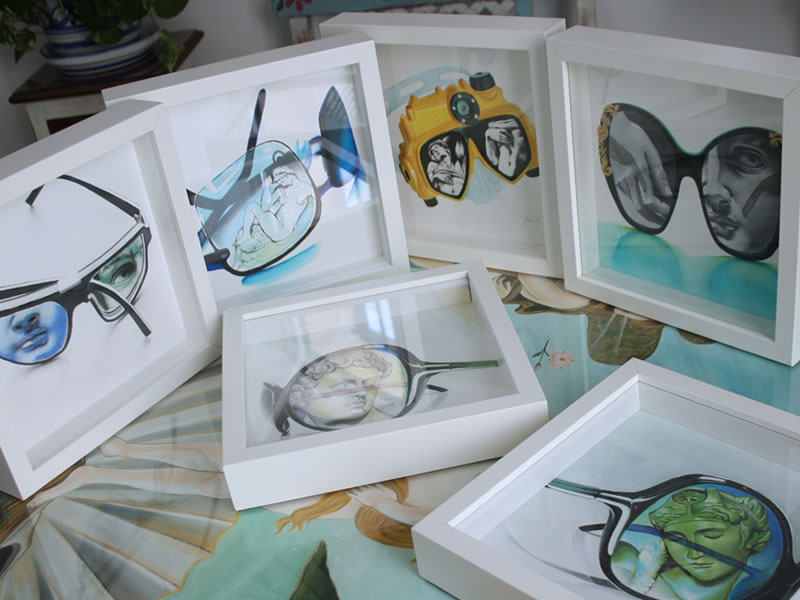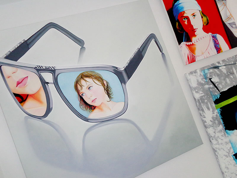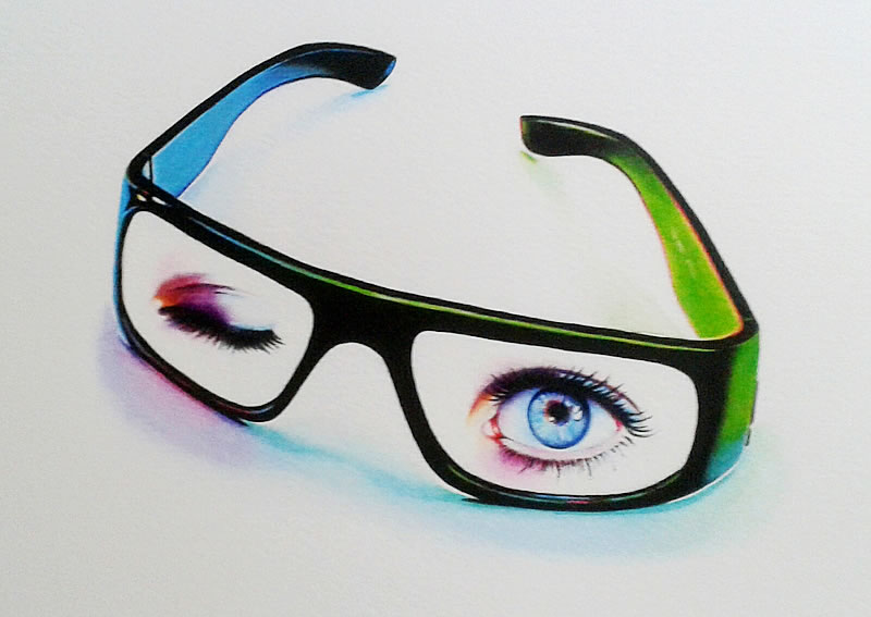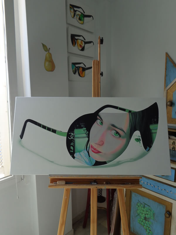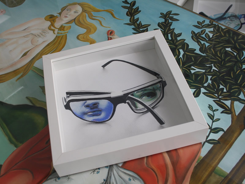 "Atrapados" surge como un juego de encuadres: encuadre de las gafas dentro del lienzo o papel, jugando a veces con las sombras que éstas proyectan sobre la superficie que las sustenta; y encuadre de los retratos dentro de las gafas, utilizadas como medio para enfocar aquellos detalles que me interesan de la expresión captada en un instante concreto.
