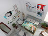 El joven del chaquetón tres cuartos de paño negro, alto, guapo, recorrió la sala a la inversa con detenimiento interesado. Cuando creí que ya se iba, trazó una diagonal y se plantó meditando frente a las esculturillas. Desde allí, cruzó en línea recta hasta los ojos de marco plateado estudiándolos de cerca y de lejos. Cada vez más azorado, trazó una nueva recta siguiendo la pared hasta las mini-Carlotas, observándolas pensativo. Volvió hasta "De soslayo" lo escudriñó con calma, volvió a las mini-Carlotas, pero una mirada descuidada se cruzó con la de Miguel, que aprovechó la ocasión para ofrecerle una tarjeta y así darle un respiro.