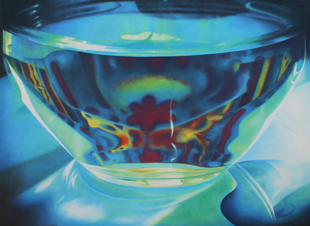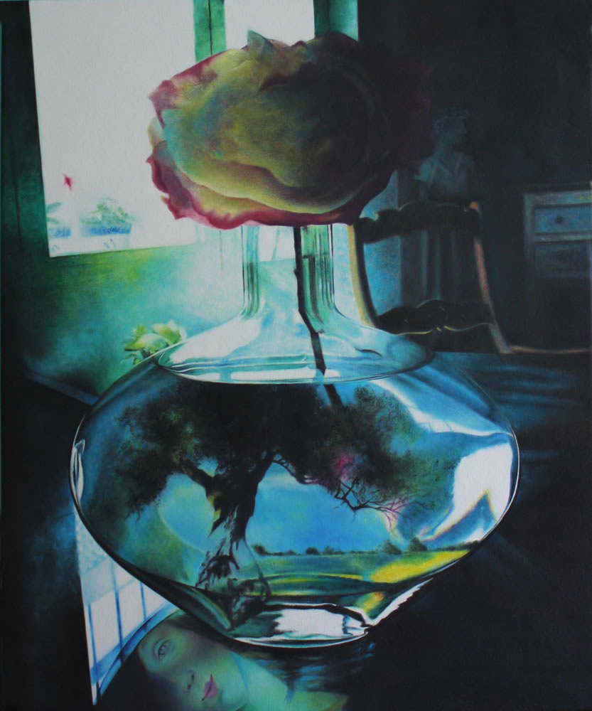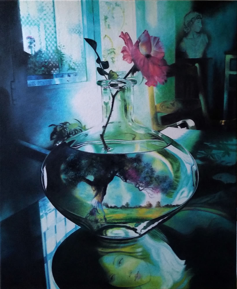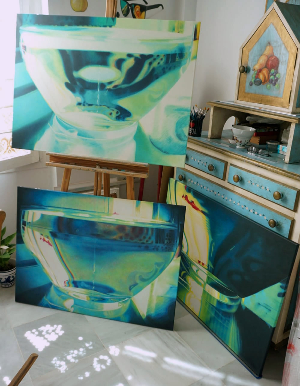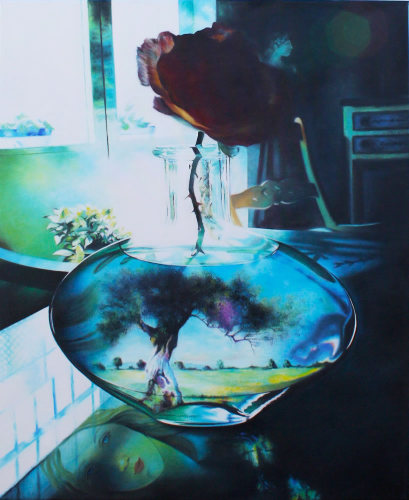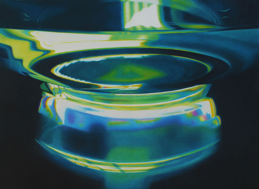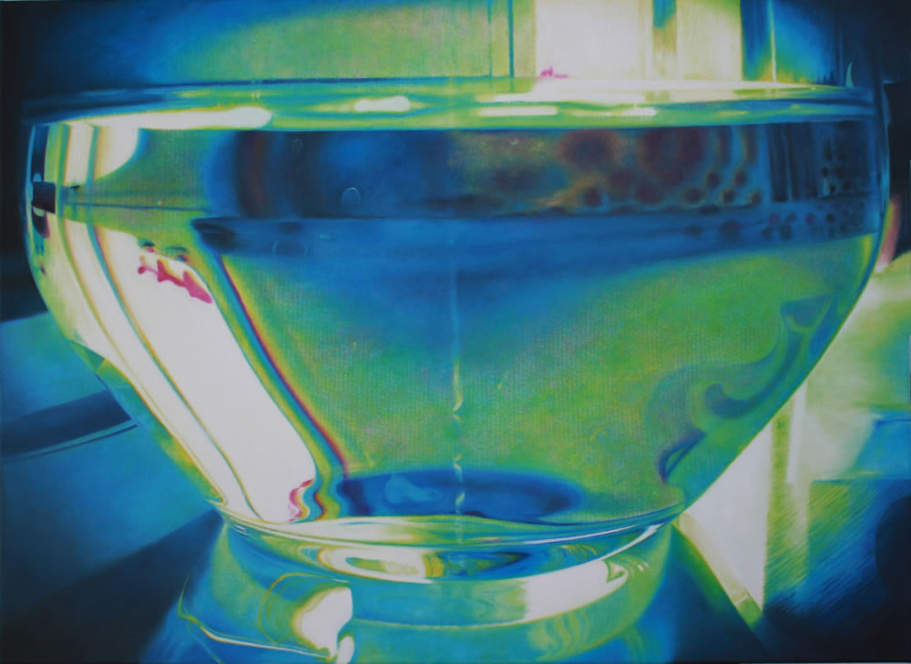 "Inmersiones" recoge una serie de pinturas al óleo inspiradas en los efectos que produce un rayo de sol al incidir sobre un recipiente de cristal con algo de agua.