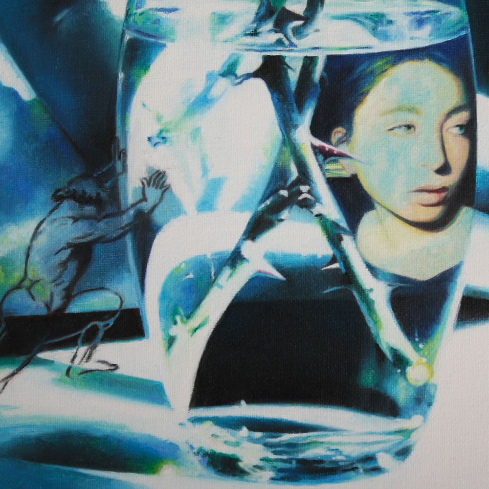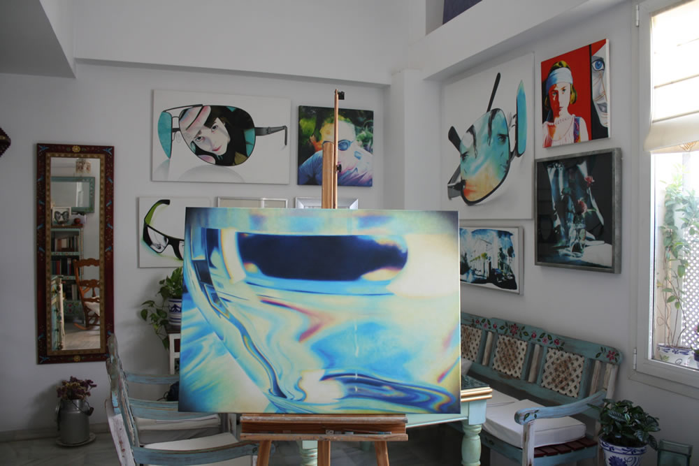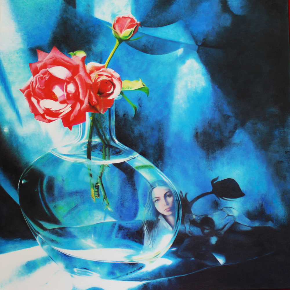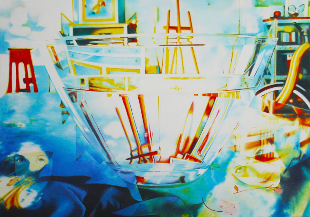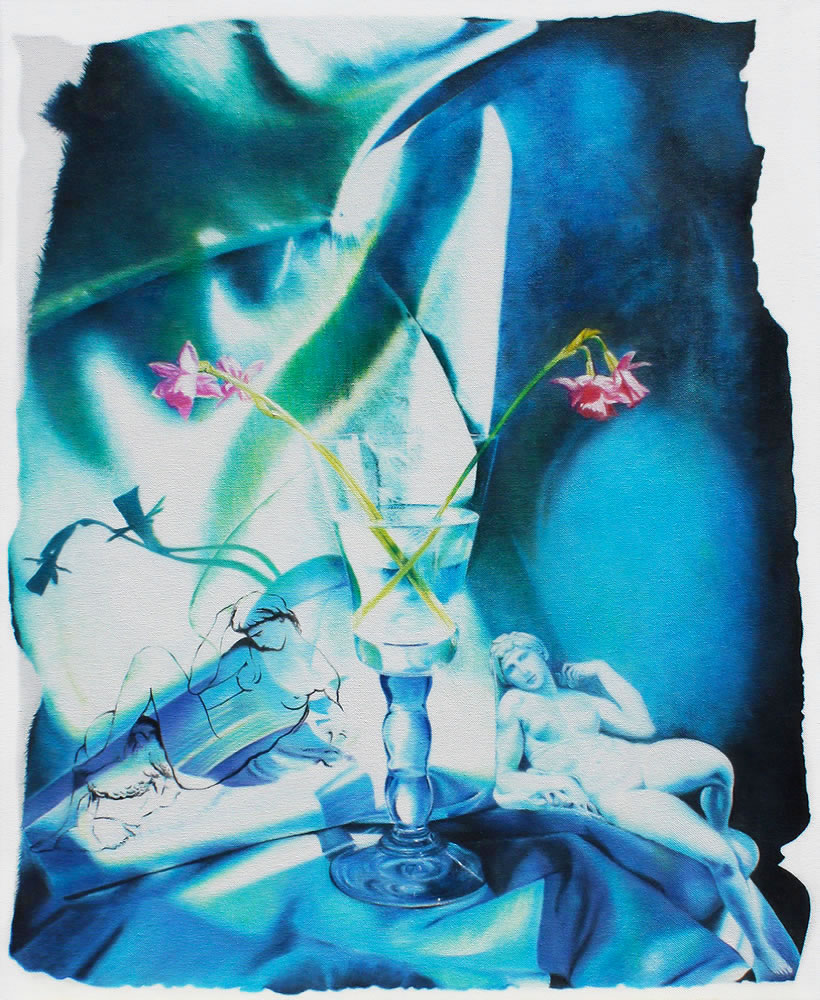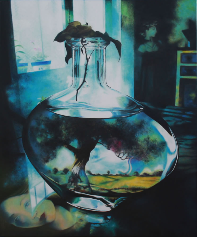 "Inmersiones" recoge una serie de pinturas al óleo inspiradas en los efectos que produce un rayo de sol al incidir sobre un recipiente de cristal con algo de agua.